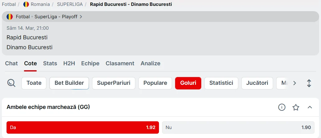 Ca să fie lucrurile cât mai clare, hai să-ți dau și exemple. Să luăm meciul Rapid – Dinamo din prima etapă a play-off-ului Superligii. Ambele echipe sunt ofensive și este faza campionatului la finalul căreia se acordă titlul. Pe deasupra, ambele echipe au obiective mărețe, apărări nu tocmai sigure și jucători de calitate în atac. Anticipez că ambele echipe vor marca, deci pariez pe „Da” la Superbet.