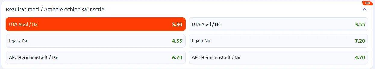 - Dacă rezultatul final va fi, să zicem, 2-1 pentru UTA, pariul va fi câștigător. A câștigat UTA și au marcat ambele.