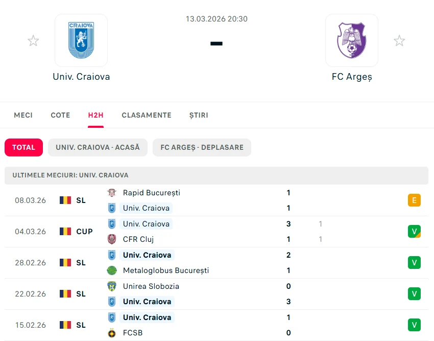 În imaginea de mai sus, vedem că Universitatea Craiova marchează mult, dar și primește goluri la aproape fiecare meci.