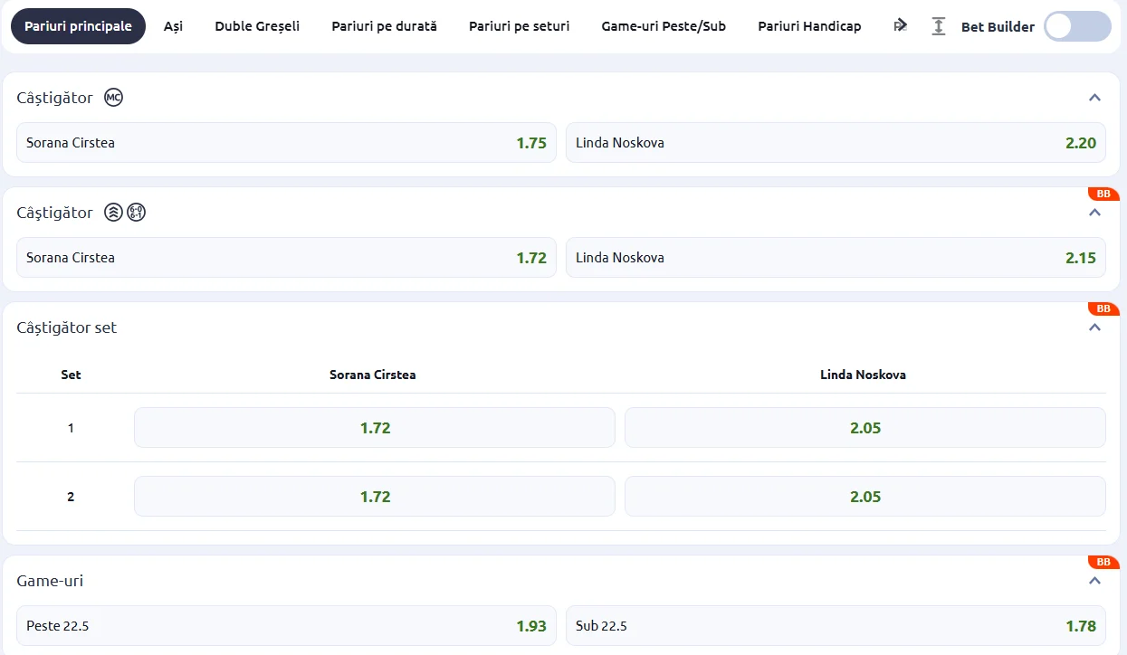 Nu uita că ai la dispoziție și Bet Builder. Acesta îți permite să ai mai multe selecții din același meci pe un bilet. Totodată, vezi care sunt exact regulile pentru evenimente precum abandonul sau amânările meciurilor. În aceste cazuri, pariul respectiv poate fi anulat.