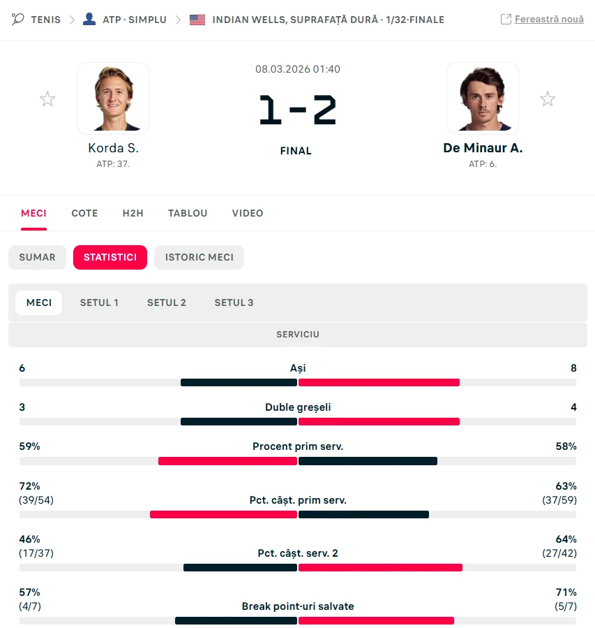 Totodată, la noi pe site, vei putea analiza performanțele jucătorilor, forma lor recentă și întâlnirile directe (H2H) între jucători.